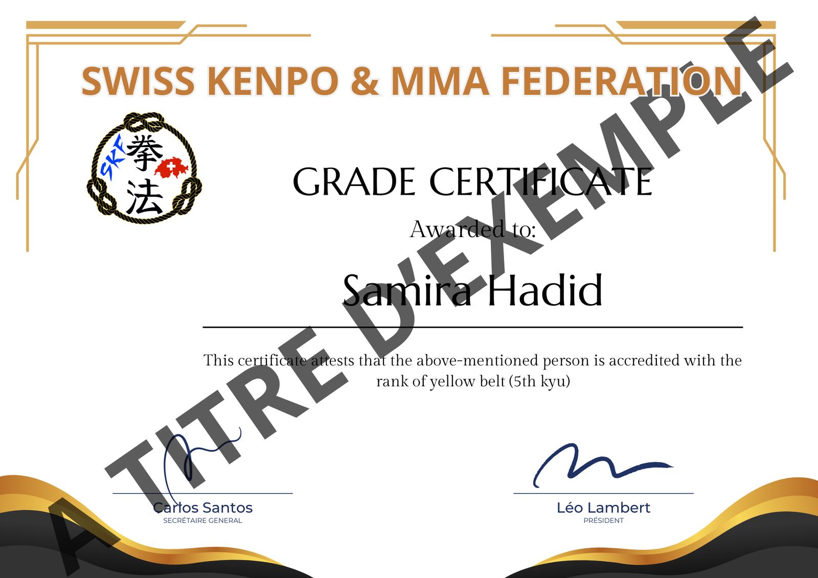 Vous souhaitez certifier vos grades? Pas de problème. La SKF certifie tous les grades que vous possédez. Il suffit de nous envoyer la preuve et nous vous accordons la correspondance. Vos certificats et diplômes sont alors recunnus par l’IKF et ses membres ainsi que la majorité des fédérations internationales.